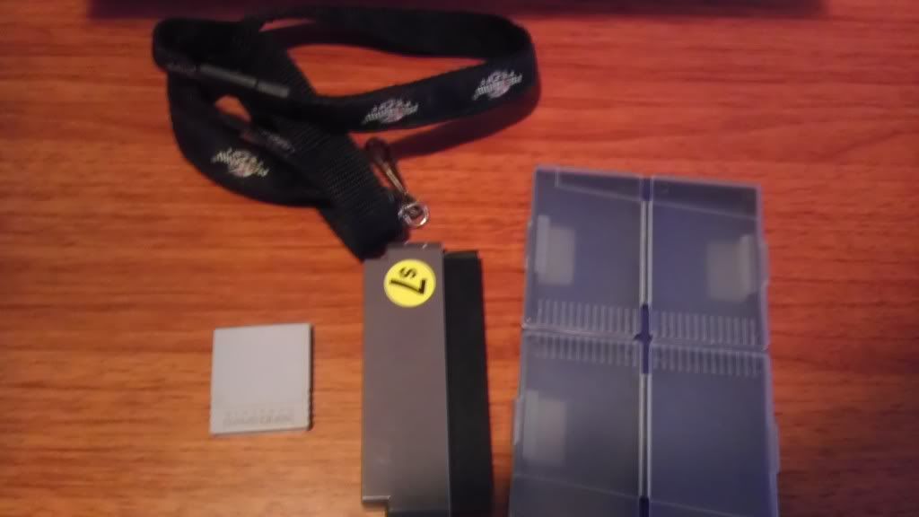 GameCube memory card, GBA game case, NES-to-Famicom converter (lets you play NES games on your Famicom, not the other way around), Metroid Prime landyard (I got this as an employee at KB Toys in the early 2000s)