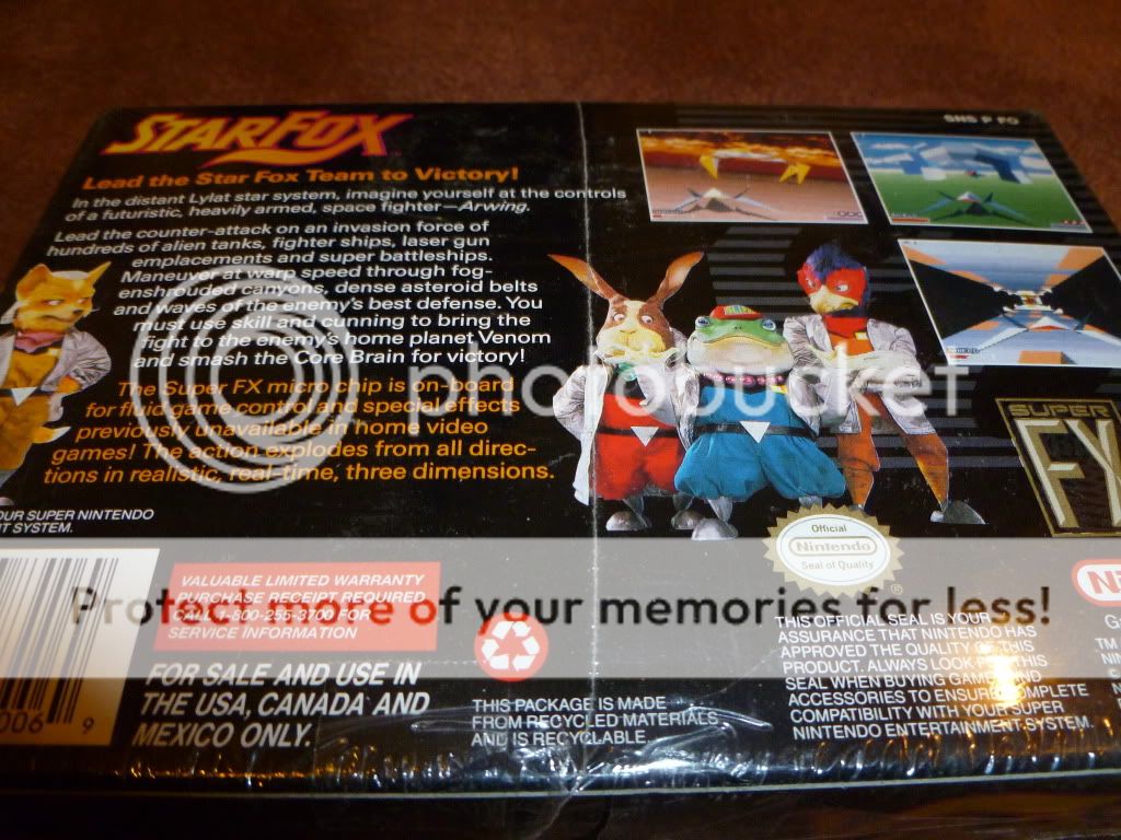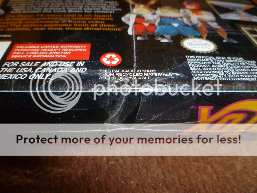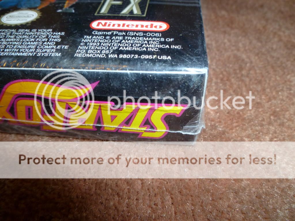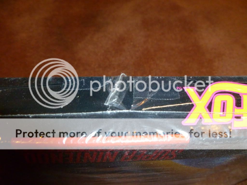 Hi guys, I am auctioning off a copy of Star Fox SNES that is factory sealed. Though it is factory sealed it has tears in the plastic that the previous owner tried to repair by putting scotch tape over the rips. It is exactly as I bought it so please don't judge me...haha. I was part of a bad deal on ebay. There is a tear on the bottom where the vertical seam comes in and top right corner is poking through.