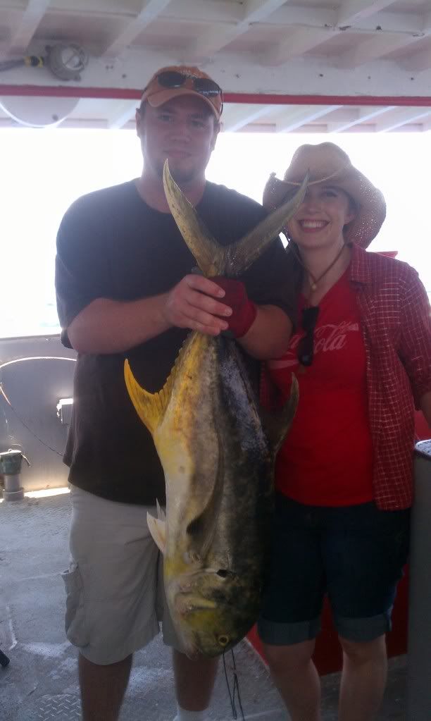 I thought I would post another picture of me here since most of you have only seen the one I posted in this thread a while back. This is me and the wife last summer on our fishing trip in the Gulf off of Port Aransas, TX. My 5' 3" 120 LB wife caught the biggest fish of the day on the boat. I tried to help her reel it in a few times but she just told me to fuck off, she could do it herself...I love that woman.
